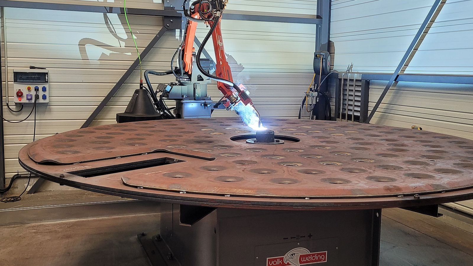 Designed by Valk Welding, the welding robot installation combines a TL-1800WGH robot with an integrated 450A welding power source and a programmable rotary manipulator with a 5-ton capacity. The cell completes each spiral weld in four and a half minutes, or the 110 welds on a large plate in eight and a half hours with an effective duty cycle of 97%.