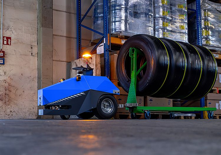 Rigdon decided to autonomise the following process first: The robot moves the tyre trolleys between the production stations and the warehouse, coupling and uncoupling them autonomously in each case.